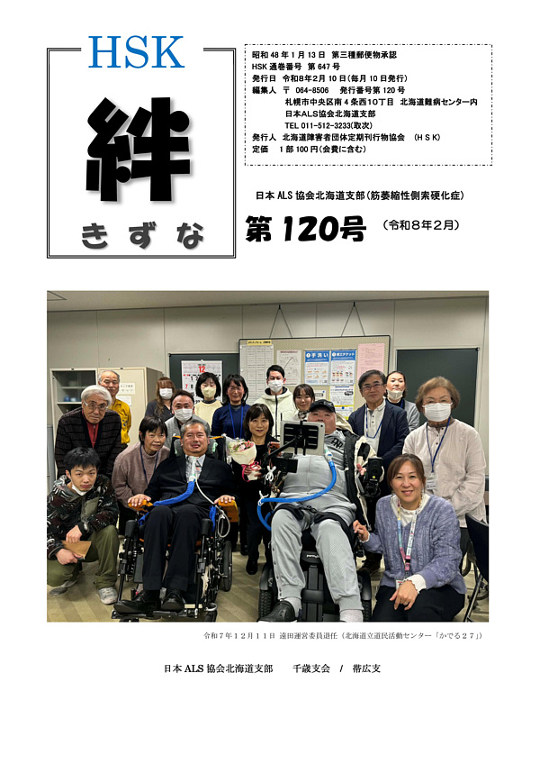 「絆(きずな)」とは 日本ALS協会北海道支部が年4回発行している機関誌です。ALSに関する情報はもちろんのこと、皆様に役立つ情報を掲載しております。